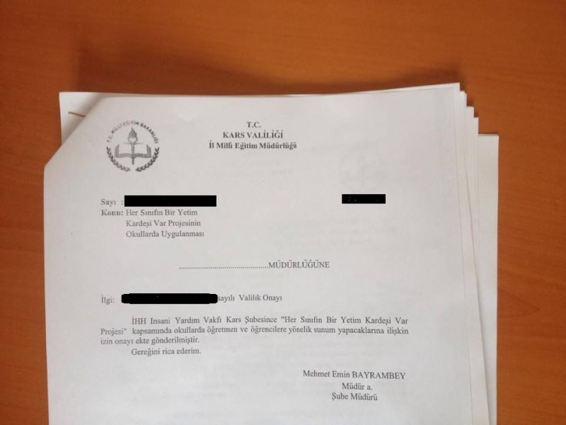 İHH tarafından yürütülen ‘Her sınıfın yetim bir kardeşi var’ projesi kapsamında Kars’taki liselere Valilik onaylı yazı gönderildi. Yazıda İHH’nın sınıflarda sunum yapılmasına izin verildiği ifade ediliyor.